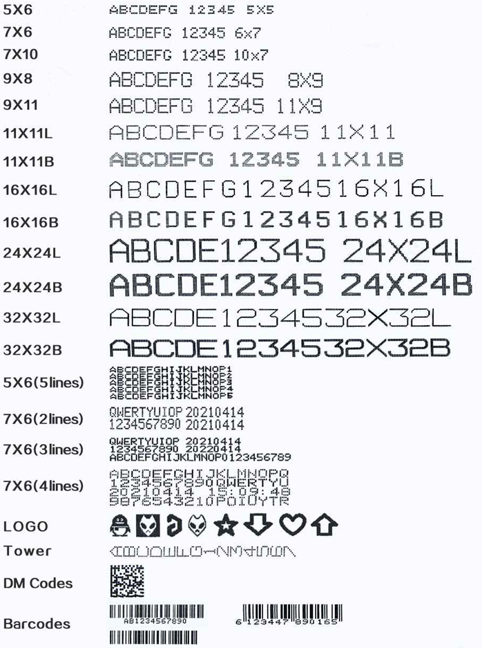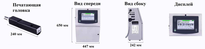 Возможности печати: текст, время, дата, смена, счетчики, внешние данные, линейные штрих-коды, 2-мерные штрихкоды, логотипы (макс. 34 точки в высоту)